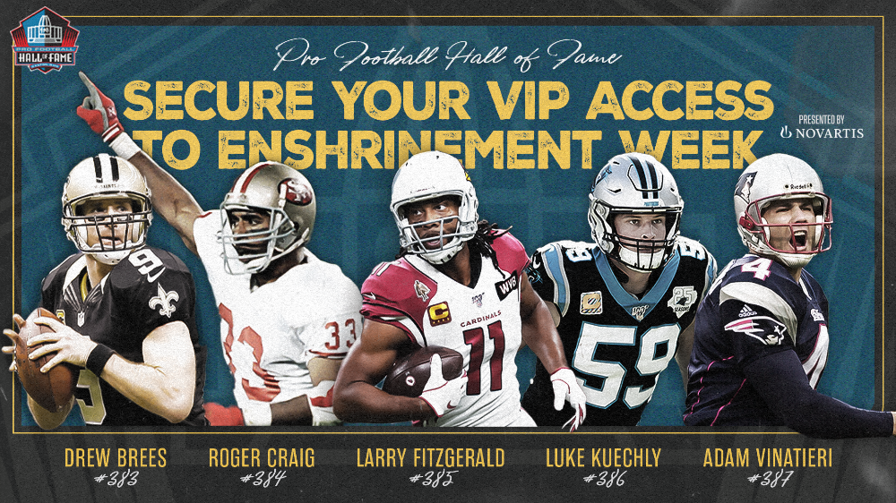 The newest members of the Pro Football Hall of Fame are quarterback DREW BREES, running back ROGER CRAIG, wide receiver LARRY FITZGERALD, linebacker LUKE KUECHLY and placekicker ADAM VINATIERI. Craig was among the Finalists in the combined Seniors/Coach/Contributor group; the others came through the Modern-Era Players category.